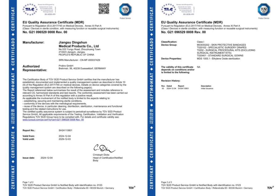 Dingshun Medical hiện đã vượt qua nhiều chứng nhận quốc tế bao gồm CE, MDR, FDA, ISO13485 và ISO9001.